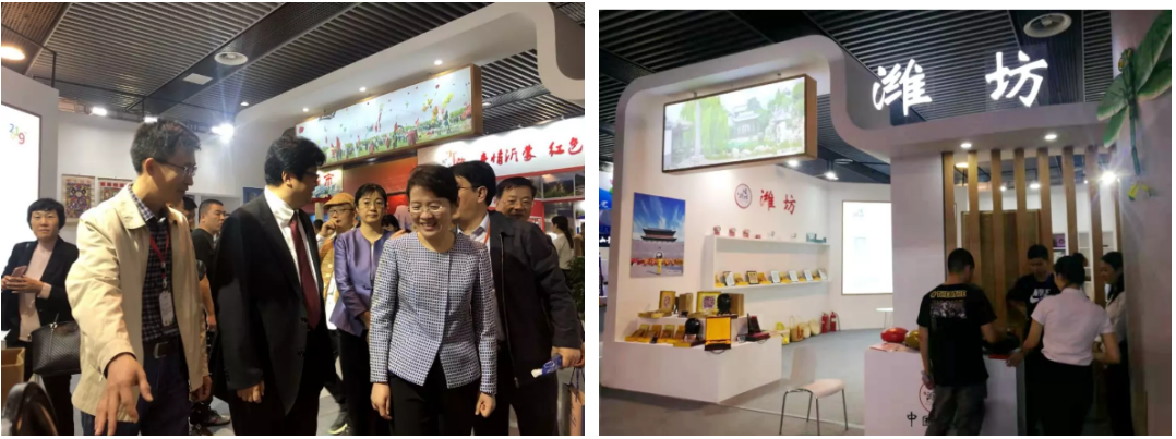Weifang Bureau of Culture and Tourism has set up a 72-square-meter special exhibition area at the main venue of the Expo, and organized companies such as Meifeiyi Mall, Anqiu Shengchuan Drinks and Qingyanzhai, as well as folk artists and inheritors of intangible cultural heritage and masters of arts and crafts including Zhang Yunxiang, Yang Hongwei, Du Jiqing, etc. to participate in the exhibition. The exhibition cover more than 50 cultural and creative products and tourism products such as kites, New Year pictures, silver inlaid mahogany lacquerware, black pottery, paper-cutting, futons, straw bags, straw paintings, Zhucheng spring tea, burdock series products and so on.