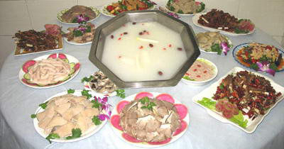 By efforts of cooking workers of generations, Whole-sheep Banquet has been well-developed and formed its own style. More than 80 dishes with different lucky names in fine different colors, aroma and tastes can be made from the meat of just one sheep by different cooking ways of frying, stewing, steaming, deep-frying, flash-frying, pan-frying, simmering, and so forth, to make the tastes of mellow, non-greasy, soft and light, light, crisp and tender fresh and so on. The whole-mutton Soup is hot and sour, cayenne flavored fragrance and de-smelled.