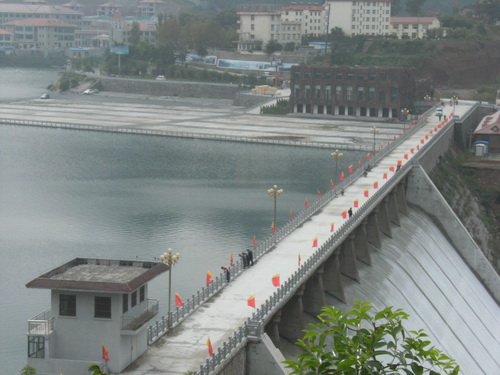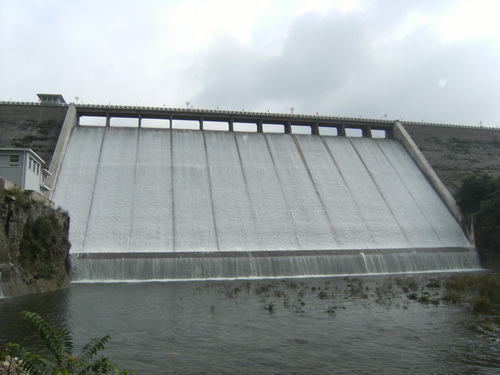 溢流坝位于重力坝桩号B0+057—B0+173坝段上,堰顶高程336.10 m,堰顶宽110.0 m,其剖面采用克奥曲线,设计堰上水头2.44 m,设计流量887m³/s。消能采用挑流方式,挑射角25度。溢流坝上建有交通桥,全长116 m,桥宽6.5 m,桥墩厚0.6 m,共11孔,每孔净宽10 m。
