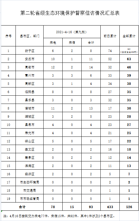4月16日,山东省第四生态环境保护督察组向我市交办第九批信访举报件共92件(来电77件、来信15件,其中1件涉及2个县市区),共涉及16个县市区:高密市14件、诸城市13件、安丘市11件、坊子区8件、临朐县8件、青州市6件、潍城区5件、峡山区5件、寿光市4件、昌邑市4件、高新区4件、昌乐县3件、奎文区2件、寒亭区2件、滨海区2件、经济区2件。