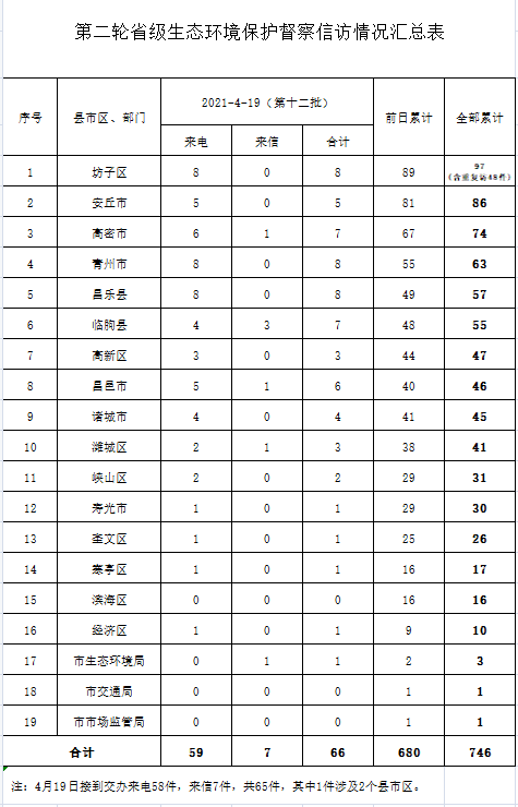 4月19日,山东省第四生态环境保护督察组向我市交办第十二批信访举报件共65件(来电58件、来信7件,其中1件涉及2个县市区),共涉及15个县市区和1个市直部门:坊子区8件、青州市8件、昌乐县8件、高密市7件、临朐县7件、昌邑市6件、安丘市5件、诸城市4件、潍城区3件、高新区3件、峡山区2件、奎文区1件、寒亭区1件、寿光市1件、经济区1件、市生态环境局1件。