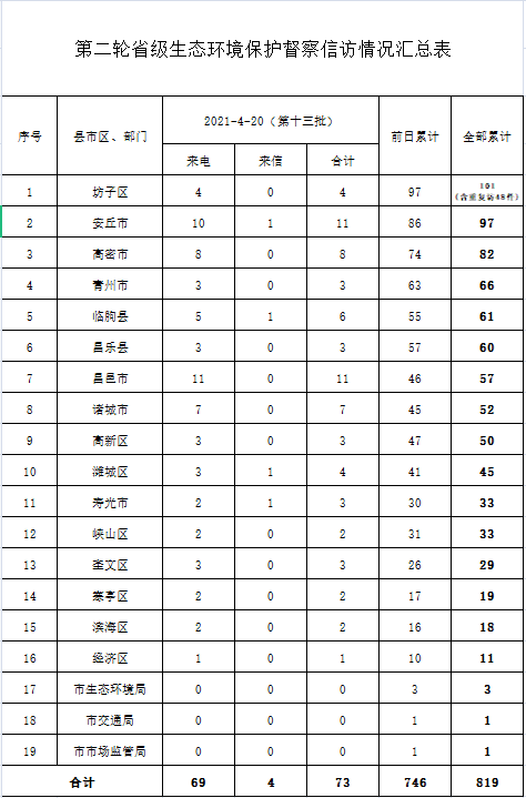 4月20日,山东省第四生态环境保护督察组向我市交办第十三批信访举报件共73件(来电69件、来信4件),共涉及16个县市区:安丘市11件、昌邑市11件、高密市8件、诸城市7件、临朐县6件、潍城区4件、坊子区4件、奎文区3件、青州市3件、寿光市3件、昌乐县3件、高新区3件、寒亭区2件、滨海区2件、峡山区2件、经济区1件。