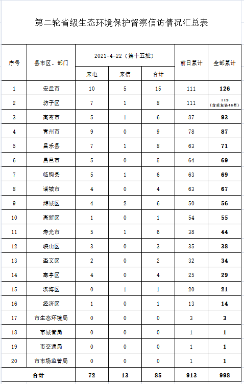 4月22日,山东省第四生态环境保护督察组向我市交办第十五批信访举报件共85件(来电72件、来信13件),共涉及16个县市区:安丘市15件、青州市9件、坊子区8件、昌乐县8件、潍城区6件、寿光市6件、高密市6件、临朐县6件、昌邑市5件、寒亭区4件、诸城市4件、峡山区3件、奎文区2件、高新区1件、滨海区1件、经济区1件。