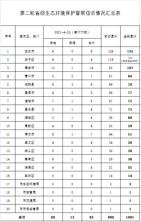 4月23日,山东省第四生态环境保护督察组向我市交办第十六批信访举报件共93件(来电80件、来信13件),共涉及14个县市区:高密市14件、安丘市9件、临朐县9件、诸城市8件、昌邑市8件、寒亭区7件、青州市7件、寿光市7件、奎文区4件、潍城区4件、坊子区4件、昌乐县4件、高新区4件、滨海区4件。