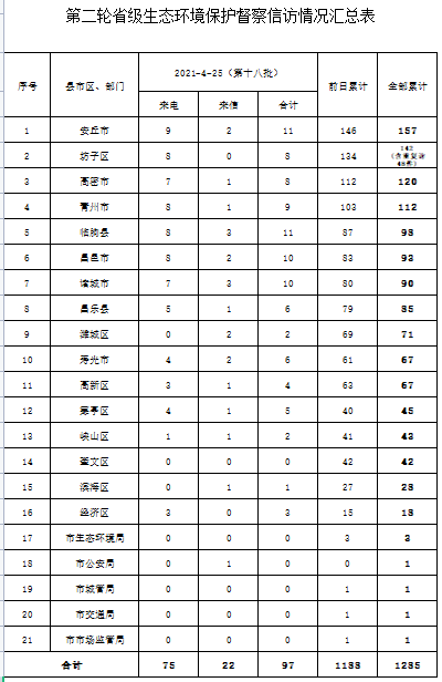 4月25日,山东省第四生态环境保护督察组向我市交办第十八批信访举报件共97件(来电75件、来信22件),共涉及15个县市区和1个市直部门:安丘市11件、临朐县11件、诸城市10件、昌邑市10件、青州市9件、坊子区8件、高密市8件、寿光市6件、昌乐县6件、寒亭区5件、高新区4件、经济区3件、潍城区2件、峡山区2件、滨海区1件、市公安局1件。
