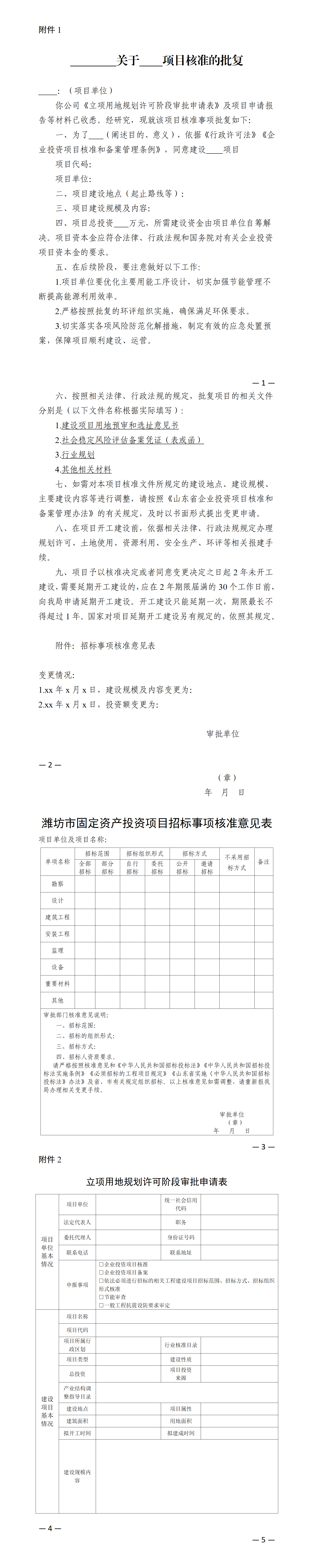 (一)申请表单。项目单位从工程审批系统提交办事申请,自动生成立项用地阶段申请表单(附件2)。审批部门要引导项目单位将固定资产投资项目核准与依法必须进行招标的相关工程建设项目招标范围、招标方式、招标组织形式核准同步勾选,实行并联办理。